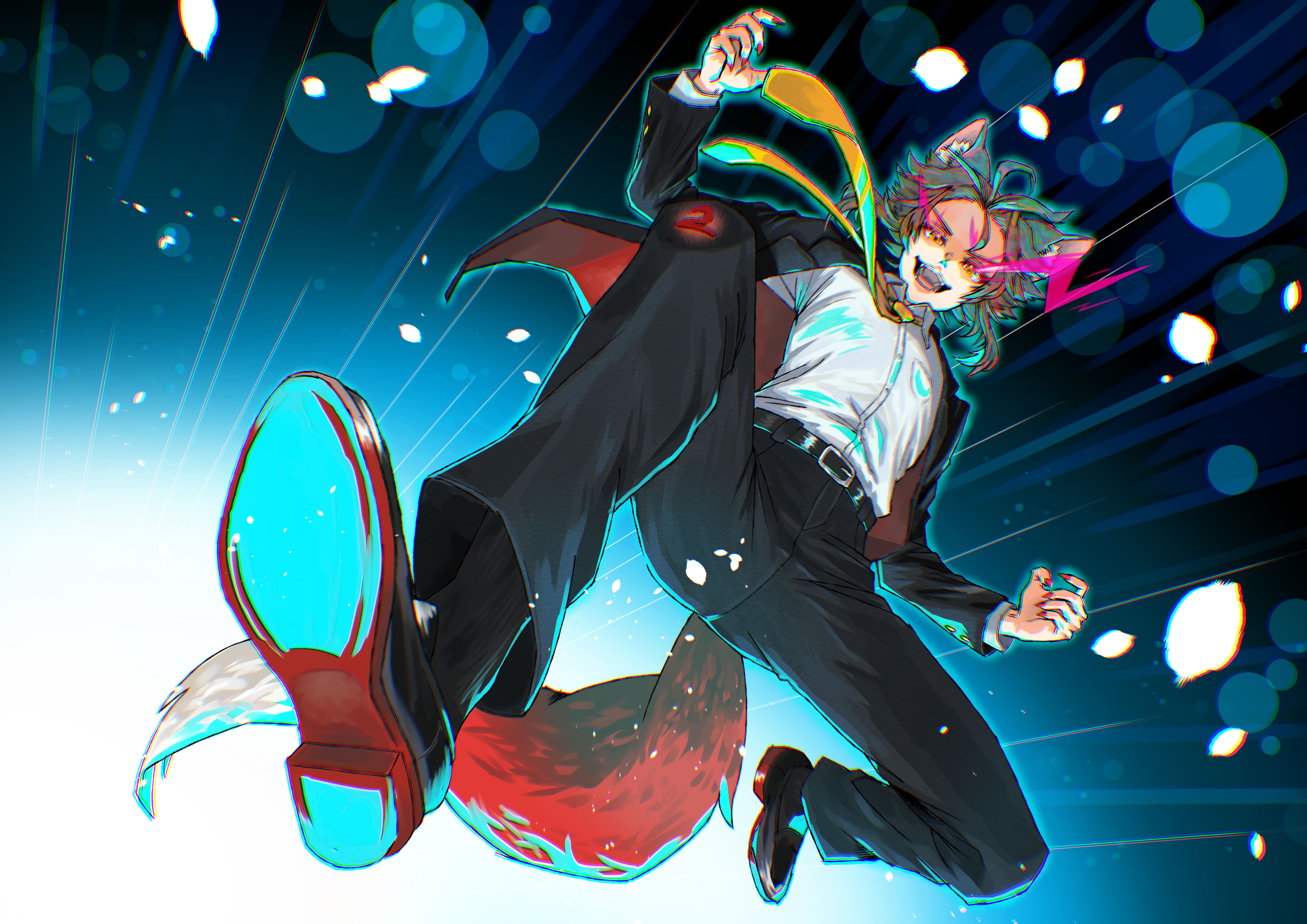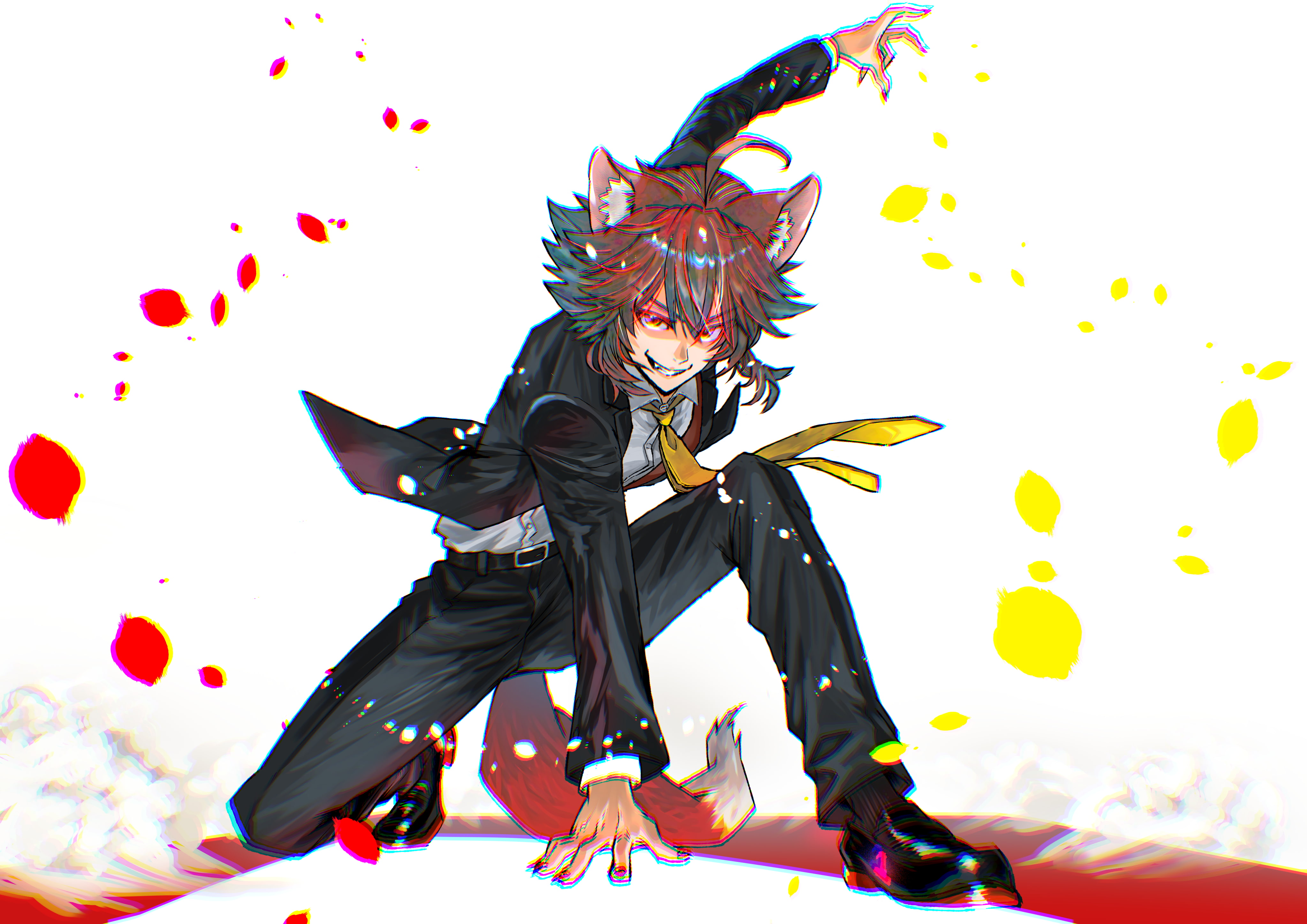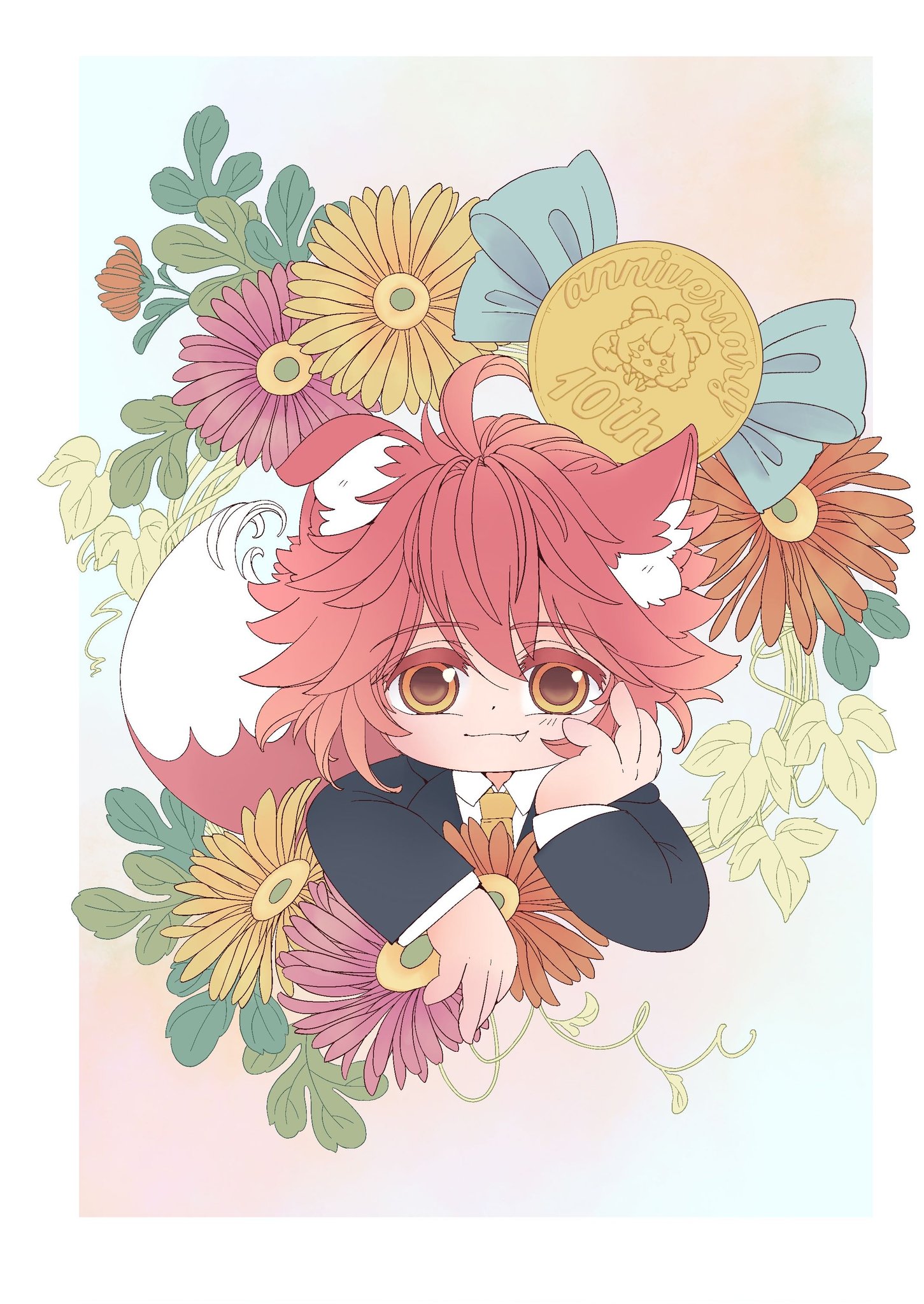 メインビジュアルは、おなじみの正装スタイル。花束贈呈されているいぬねこさんをセンターにお祝いムードに包まれている様子を表現しています。